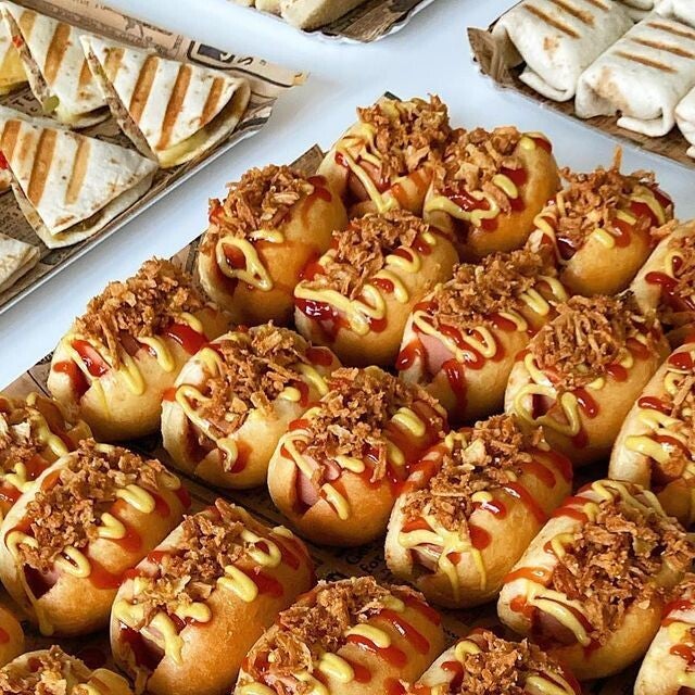 Pain brioché maison garni de saucisse avec une sauce moutarde et ketchup saupoudré d'oignons frits